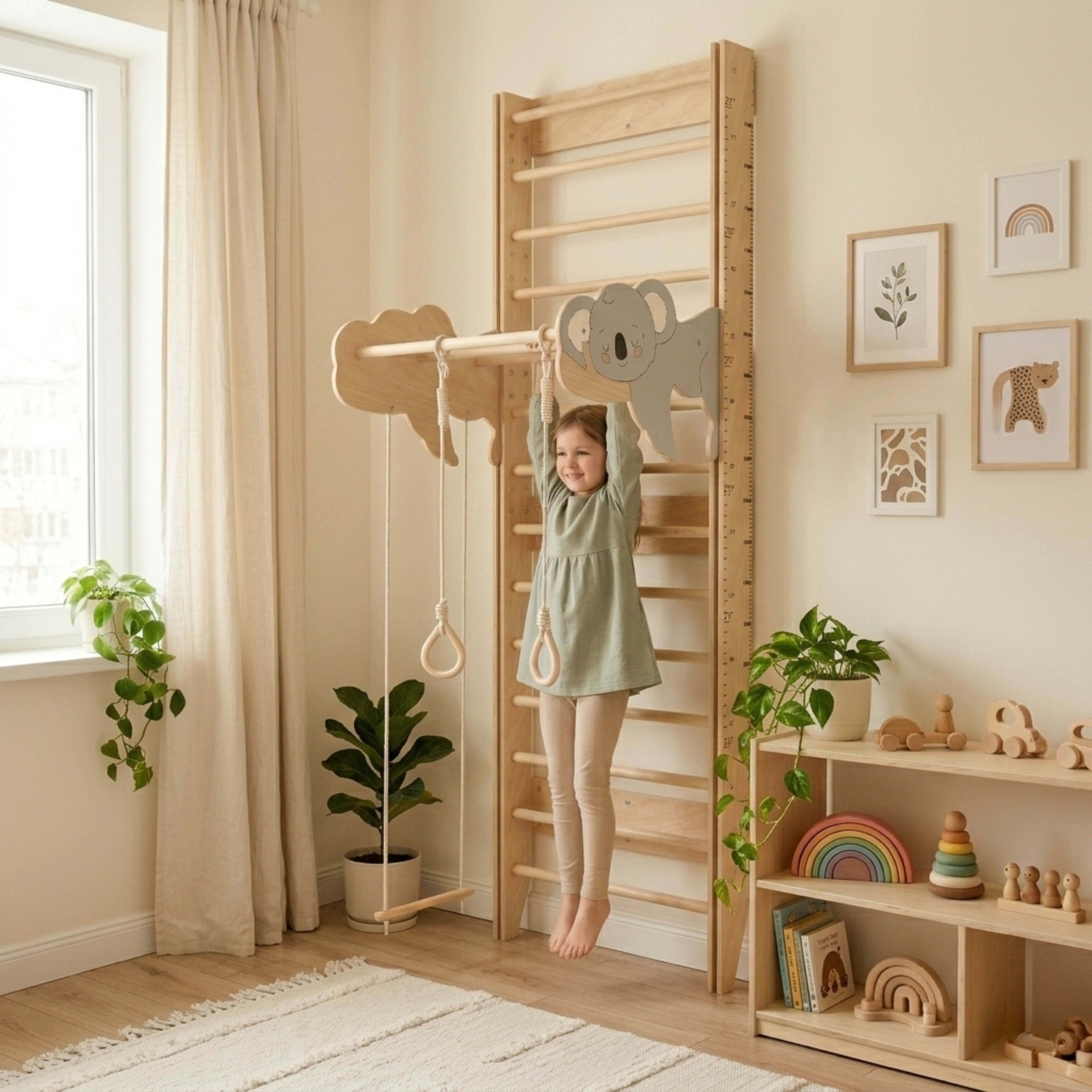 Bring joyful movement into your home with our Koala Swedish Ladder Wall Gym, a beautifully designed Montessori climbing wall that encourages children to climb, play, and grow with confidence.